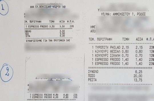 Η ίδια αλυσίδα καφέ, για τον ίδιο καφέ, έχει τρεις διαφορετικές χρεώσεις. Αυτό προκύπτει από τις παρακάτω αποδείξεις που κάνουν το γύρο του facebook και προκαλούν ποικίλες αντιδράσεις. Κάποιοι υποστηρίζουν πως αυτό είναι δικαιολογημένο λόγω της θέσης των καταστημάτων και άρα του ενοικίου που πληρώνει το καθένα και άλλοι πως πρόκειται για πρόκληση, εις βάρος των καταναλωτών. Στις αποδείξεις, οι πελάτες έχουν παραγγείλει ένα freddo espresso. Στο αεροδρόμιο Ελευθέριος Βενιζέλος, χρεώθηκε 3,50 ευρώ. Στο αεροδρόμιο της Ρόδου 4 ευρώ και στο κατάστημα της ίδια αλυσίδας στη Ρόδο, στην οδό Αμμοχώστου, η τιμή του έπεσε στο... 1,40 ευρώ!