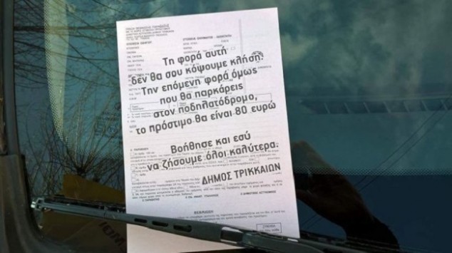 «Τη φορά αυτή δεν θα σου κόψουμε κλήση. Την επόμενη φορά όμως που θα παρκάρεις στον ποδηλατόδρομο το πρόστιμο θα είναι 80 ευρώ. Βοήθησε κι εσύ να ζήσουμε όλοι καλύτερα»...