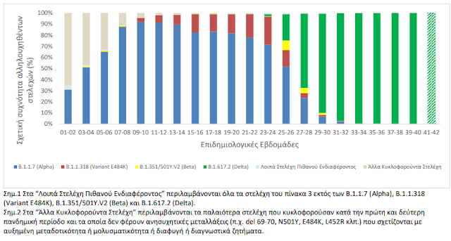 Ολοκληρώθηκε από το Eθνικό Δίκτυο Γονιδιωματικής Επιτήρησης του ιού SARS-CoV-2, που λειτουργεί υπό το συντονισμό του ΕΟΔΥ, η γονιδιωματική ανάλυση σε 387 δείγματα που έχουν επιλεγεί τυχαιοποιημένα ή στοχευμένα και αφορούν στην περίοδο 29 Σεπτεμβρίου 2021 έως 18 Οκτωβρίου 2021. Από τον έλεγχο των 387 δειγμάτων, αναδείχθηκαν συνολικά 384 δείγματα με στελέχη ειδικού ενδιαφέροντος (Variants Of Concern - VOC).