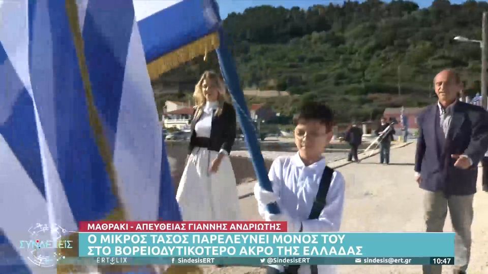 Ιδιαίτερα συγκινητική στιγμή σήμερα, ανήμερα της εθνικής επετείου της 28ης Οκτωβρίου, 21 χρόνια μετά την τελευταία παρέλαση στο Μαθράκι, όταν ο 9χρονος Τάσος, ο μοναδικός μαθητής του ακριτικού νησιού, παρέλασε μόνος κρατώντας την γαλανόλευκη σημαία, μπροστά στους περίπου 35 μόνιμους κατοίκους, που έχουν γίνει δεύτερη οικογένειά του.