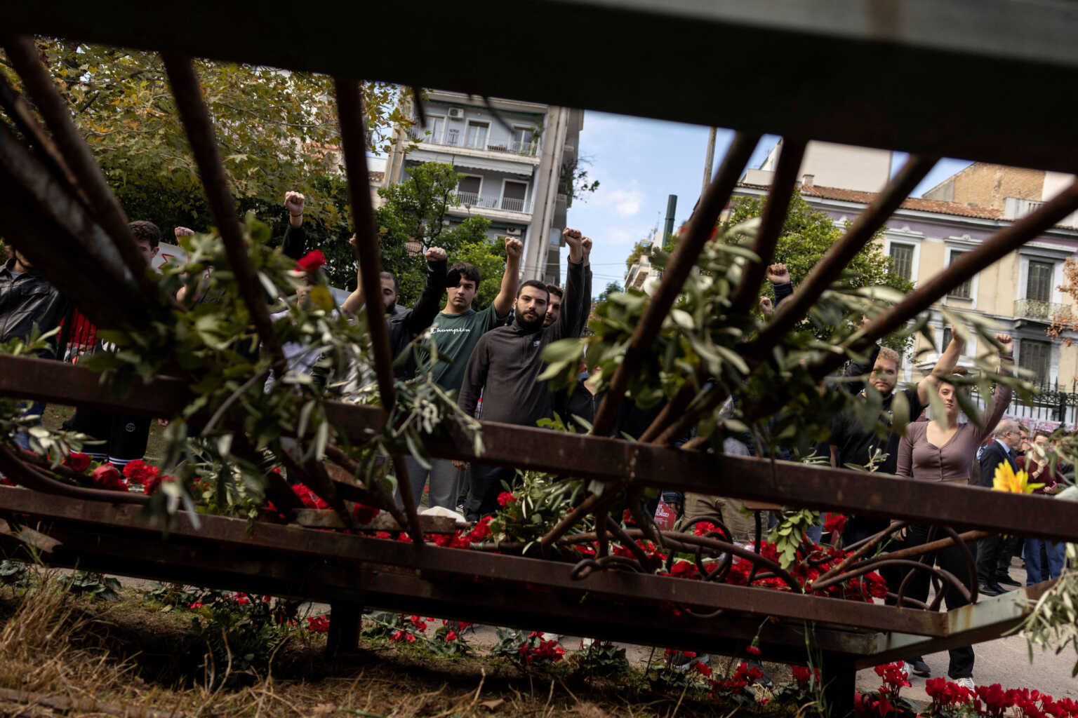 Η χτυπημένη από τα τανκς πύλη του Πολυτεχνείου και το μνημείο των φοιτητών που έχασαν τη ζωή τους καλύπτονται ήδη από γαρίφαλα και στεφάνια.