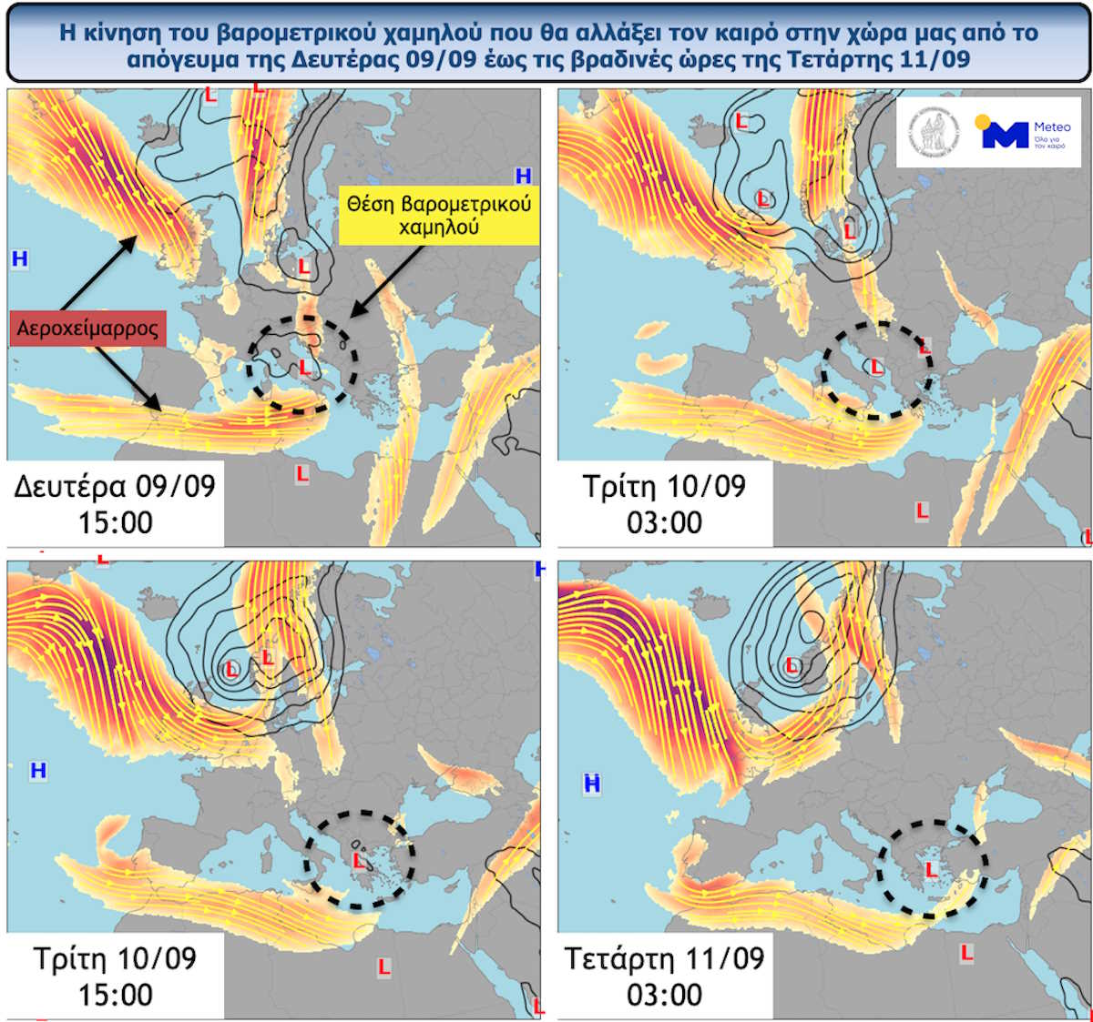 Υπενθυμίζεται ότι, ο αεροχείμαρρος είναι ένα ισχυρό ρεύμα αέρα σε ύψος περίπου 10-11 χιλιομέτρων από την επιφάνεια της γης με κίνηση κατά βάση από τα δυτικά προς τα ανατολικά και η κίνηση του καθορίζει την δημιουργία και τη κίνηση των βαρομετρικών συστημάτων. Η ανατολική – νοτιοανατολική κίνηση του βαρομετρικού χαμηλού από την περιοχή της Ιταλίας προς τα Νότια Βαλκάνια και τη χώρα μας κατά τη διάρκεια της Δευτέρας 09/09 θα έχει ως αποτέλεσμα την σταδιακή αλλαγή του καιρού από τα δυτικά της χώρας μας με βροχές και καταιγίδες.